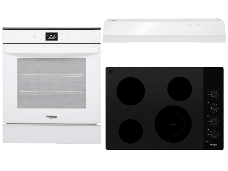 Whirlpool® 24" White Single Electric Wall Oven Model #: WOS52ES4MW Cook however you want with a 24 inch convection wall oven. Bake multiple items at once with True Convection Cooking and clean this 24 inch self cleaning wall oven using the Adjustable Self-Clean Cycle., Whirlpool® 30" Black Electric Cooktop Model #: WCE55US0HB Cook all your family’s favorites with an easy-to-clean cooktop designed to make the most of your mealtime routine. Get added flexibility when installing with 30 & 40 amp compatibility, or while cooking with the FlexHeat™ Dual Radiant Element. When dinner’s done, a ceramic glass cooktop makes it easy to wipe away messes., Whirlpool® 30" White Under Cabinet Range Hood Model #: WVU17UC0JW Choose the under cabinet range hood that fits your kitchen and your lifestyle. This vent hood features full-width grease filters to help keep the kitchen clean. Plus, this range hood with LED lights makes it easy to see what you’re cooking. And with a 2-speed, 270 CFM motor class, you’ll have the right amount of ventilation for every meal.