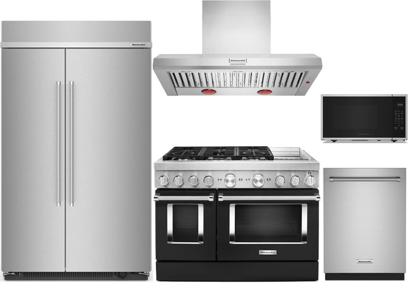 KitchenAid® 48 in. 30.0 Cu. Ft. Stainless Steel with PrintShield™ Finish Counter Depth Side-by-Side Refrigerator, KitchenAid® 48" Imperial Black Commercial-Style Freestanding Dual Fuel Range with Griddle, KitchenAid® 24" PrintShield™ Stainless Steel Built In Dishwasher, KitchenAid 48" Stainless Steel Wall Mounted Range Hood, KitchenAid® 1.5 Cu. Ft. Stainless Steel Countertop MicrowaveRead More