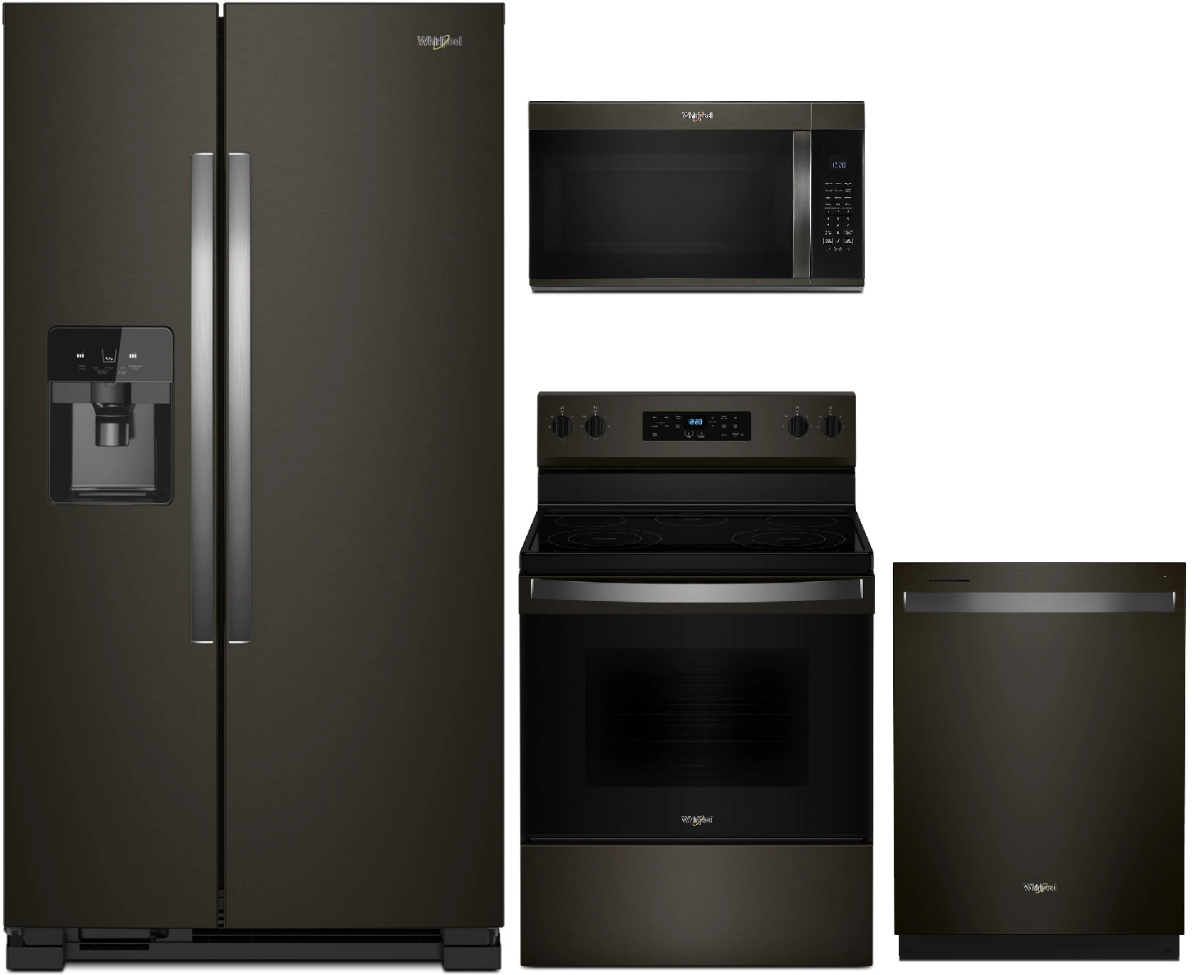 Whirlpool® 36 in. 24.6 Cu. Ft. Fingerprint Resistant Black Stainless Side-by-Side Refrigerator, Whirlpool® 30" Black Stainless Steel Freestanding Electric Range, Whirlpool® 24" Black Stainless Built In Dishwasher, and Whirlpool® 1.9 Cu. Ft. Black Stainless Steel Over the Range MicrowaveRead More