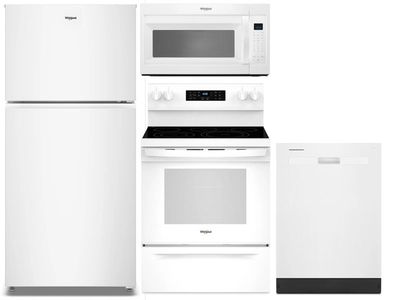 Whirlpool® 30" 19.3 Cu. Ft. White Top Freezer Refrigerator with Total Coverage Cooling, Whirlpool® 30" White Freestanding Electric Range, Whirlpool® 24" White Built In Dishwasher, Whirlpool® 1.9 Cu. Ft. White Over The Range MicrowaveRead More